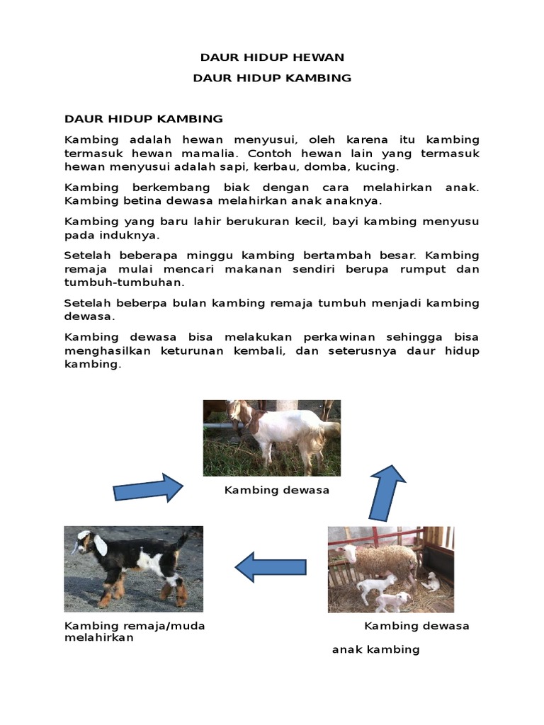 DAUR HIDUP KAMBING DAUR HIDUP KAMBING Kambing adalah hewan menyusui oleh karena itu kambing termasuk hewan mamalia Contoh hewan lain yang termasuk hewan menyusui adalah sapi kerbau domba kucing Kambing berkembang biak dengan cara melahirkan Kambing betina dewasa melahirkan anak anaknya anak Kambing yang baru lahir berukuran kecil bayi kambing menyusu